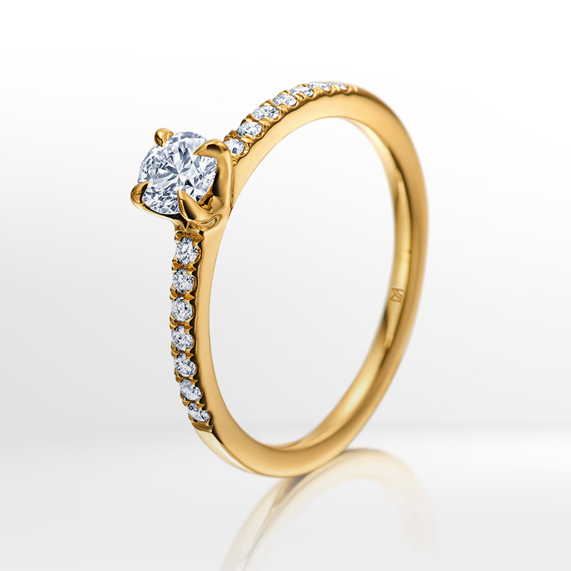 Für die Sonne in Ihrem Leben ist der filigrane und doch imposante Meister Verlobungsring aus Gelbgold (18 Karat) geschmiedet. Sein kristallklarer Brillant (0,33 ct.) wird von einer Vierer-Krappenfassung als Blickfang hervorgehoben, während an seiner Seite ein Pavé aus 14 Diamanten (0,125 ct.) leuchtet. Auf diese Weise vereinigt dieses Ringmodell große und kleine Edelsteine zu einem Zentralgestirn Ihrer Gefühle.