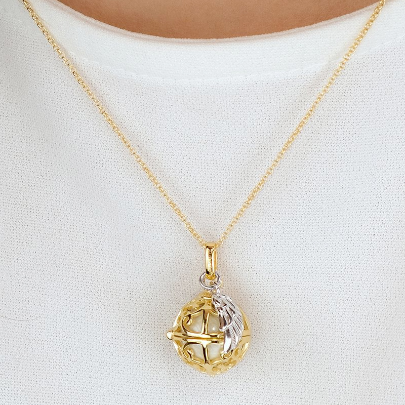 „Das ist das Wesen der Musik, dass sie die Seele zur Harmonie des Weltalls stimmt”, schwärmte bereits Pythagoras und spiegelt damit unsere Engelsrufer Damenhalskette mit Klangkugel und Flügeln wider. Gefertigt aus goldplattierten, 925er Sterling Silber, sorgt ein schimmernder Perlmutt-Effekt für glanzvolle Makellosigkeit. Er steht für Unschuld, Reinheit und zaubert dank des Schimmerst einen edlen Glanz und eine besondere Tiefenwirkung. Das zartgeformte Körbchen setzt die Klangkugel perfekt in Szene, sodass sie positive Energie und Schwingungen erzeugen kann. Mit einem zarten Klang rufen Sie einen Schutzengel oder Ihre persönlichen Gedanken zu sich.