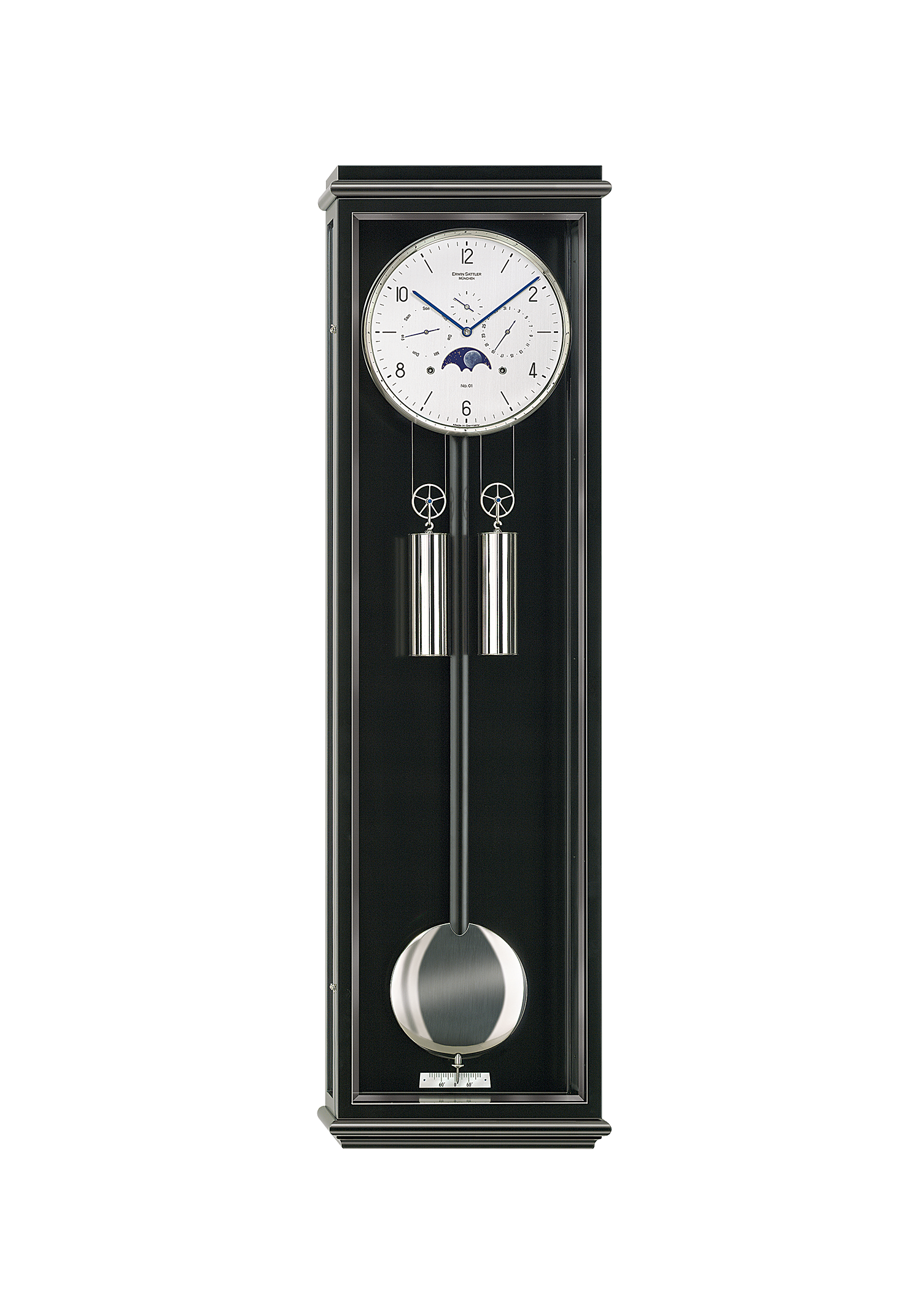 Classica KS 130 Die etwas größere Classica KS 130 ist zusätzlich zu den Merkmalen der Classica KS 100 mit einem besonders harmonischen Sekundenpendel ausgestattet. Sie ist erhältlich in schwarzem Schleiflack mit facettierten Gläsern und wahlweise römischem oder modern arabischem Zifferblatt.