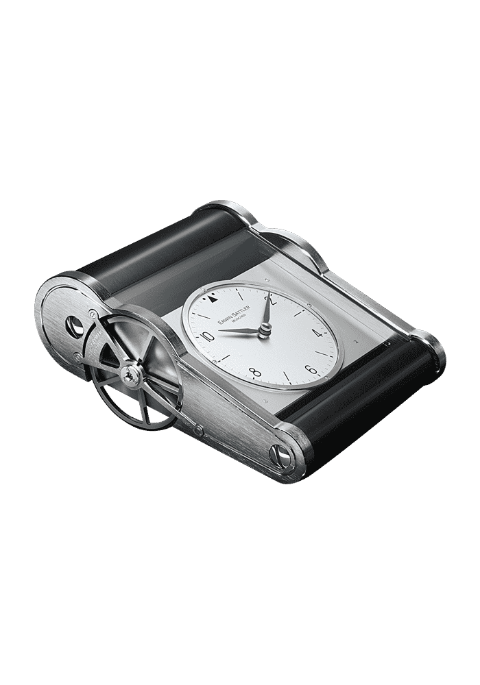Ihr entspiegeltes Glas erlaubt einen freien Blick auf das Zifferblatt, von dem die Zeit reflexfrei abgelesen werden kann. Durch ihr Quarz-Uhrwerk ist sie klein und handlich und findet überall einen geeigneten Platz. Das Zifferblatt aus eloxiertem Aluminium mit aufgesetzter, vernickelter Lünette ist nicht nur ein funktionelles Element, sondern auch ein eindeutiger Hinweis ihrer Zugehörigkeit zum Gesamtsortiment der Manufaktur. Ihren Charakter als Erwin Sattler Uhr zeigt sie auch besonders eindrucksvoll in kunstvoller Dreh- und Fräsarbeit am Gehäuse. Die Räder aus verchromtem Messing entsprechen den Seilrollen der Sekundenpendeluhren. So wird die Brücke von den größten Uhren im Sortiment zu einer der kleinsten Uhr – der neuen Office Clock.