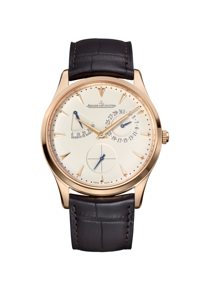 Mit der Allianz zweier symbolträchtiger Komplikationen der uhrmacherischen Tradition, der Gangreserve und der Datumsanzeige mit Zeiger, zeigt sich die Master Ultra Thin Gangreserve aus Rotgold in einem feinen und eleganten Gehäuse.