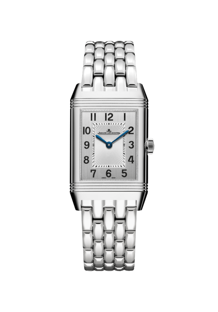 Zwei Rücken an Rücken liegende Zifferblätter offenbaren zwei unterschiedliche Antlitze, deren Zeiger von einem einzigen mechanischen Uhrwerk mit Handaufzug angetrieben werden. Darin liegt das eigentliche Wesen der Reverso Classic Medium Duetto aus Edelstahl, die ihre ungeahnte zweite Facette wie ein Geheimnis in ihrem Gehäuse hütet. Ihr Armband aus Edelstahl verleiht ihr zusätzliche Eleganz.