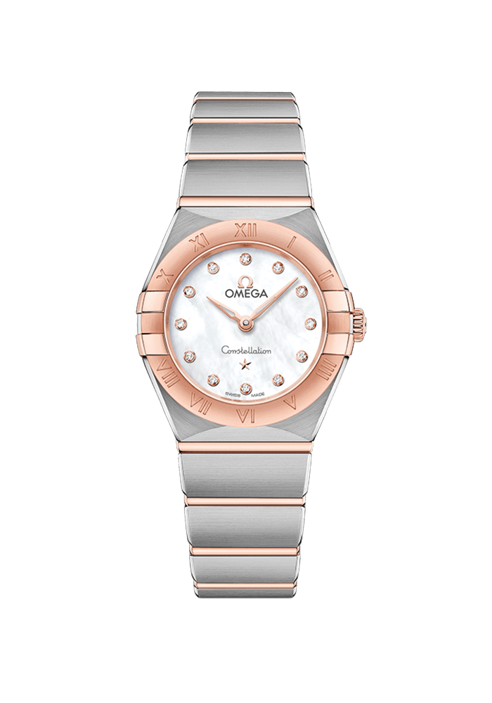 | Zifferblatt | silber, mit Diamanten besetzt, Diamantfassungen, Zeiger, Omega-Logo und Constellation-Stern aus 18 Kt Sedna™-Gold |