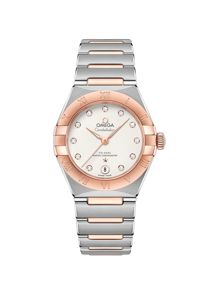 | Zifferblatt | silber, mit Diamanten besetzt, Diamantfassungen, Zeiger, Omega-Logo und Constellation-Stern aus 18 Kt Sedna™-Gold |