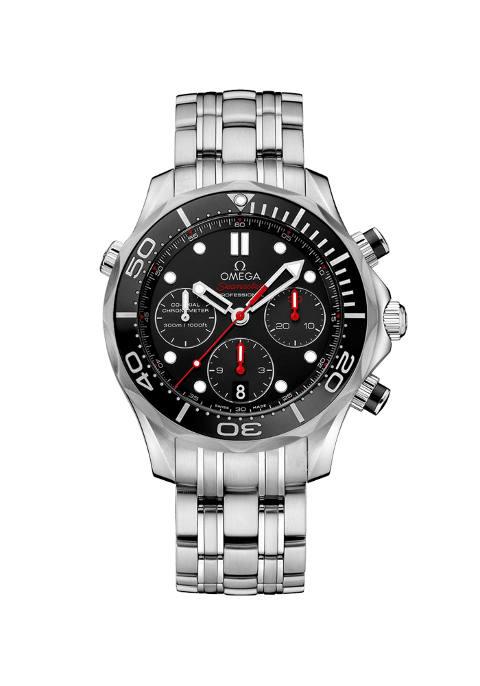 Dieser OMEGA Seamaster Diver 300 M Chronograph verfügt über ein lackiertes schwarzes Zifferblatt mit einem 30-Minutenzähler bei 3 Uhr, einem 12-Stundenzähler bei 6 Uhr und einer kleinen Sekunde bei 9 Uhr. Die schwarze, polierte, einseitig drehbare Keramiklünette ist auf einem 41,5-mm-Gehäuse aus Edelstahl mit Heliumventil und integriertem Datumskorrektor bei 10 Uhr angebracht.