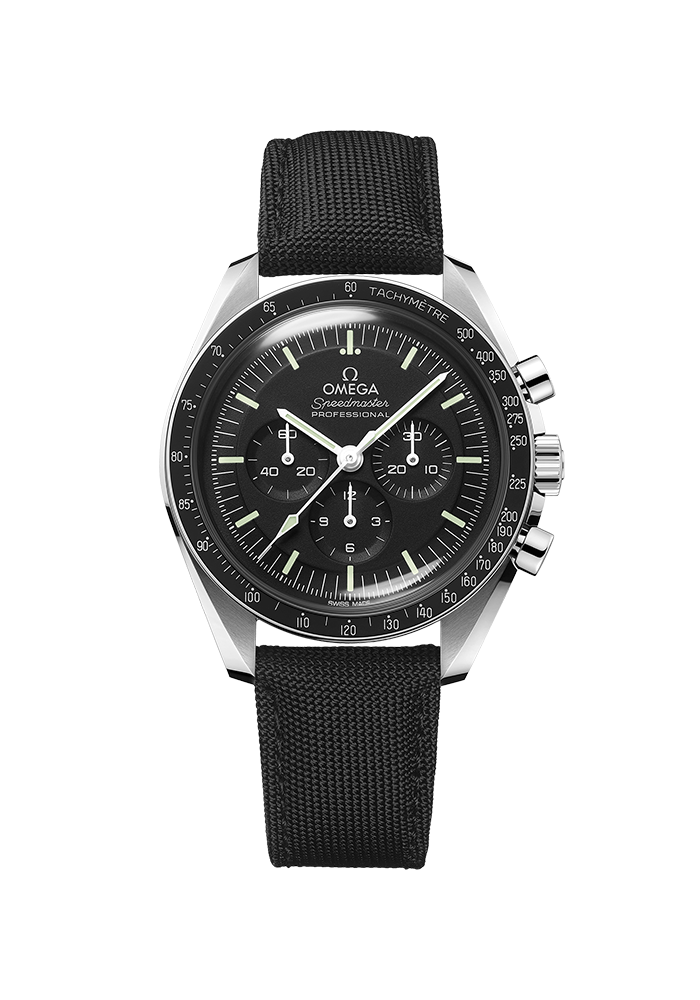 Diese 42-mm-Moonwatch aus Edelstahl wird von einem Nylonarmband am Handgelenk gehalten. Das Zifferblatt wird von Hesalitglas geschützt, und in den Gehäuseboden wurde ein Seepferdchen-Medaillon geprägt. Inspiriert von der 4. Generation der Speedmaster, die auf dem Mond getragen wurde, besitzt das Modell auch ein asymmetrisches Gehäuse, ein schwarz abgestuftes Zifferblatt und den berühmten Punkt über der 90 auf dem Lünettenring aus eloxiertem Aluminium.