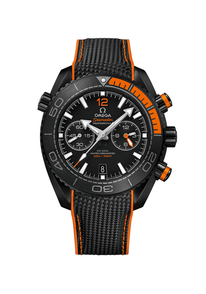 Das Gehäuse dieses bemerkenswerten 45,5 mm großen Chronographen wurde aus einem einzigen Block Keramik gefertigt. Die besondere einseitig drehbare Lünette hingegen besteht aus einer Kombination von orangefarbenem Kautschuk und Keramik. Diese Mischung wurde für das erste 15-Minuten-Segment verwendet, wohingegen der Rest der Tauchskala aus Liquidmetal™ besteht. Die gebürsteten Drücker sind ebenfalls mit orangefarbenem Kautschuk versehen. Zum schwarzen Keramikzifferblatt gehören Zeiger und Indizes aus 18 K Weißgold. Dank des patentierten NAIAD-LOCK-Systems hat OMEGA einen ausgerichteten Gehäuseboden geschaffen, der den eingravierten Schriftzug immer in der richtigen Position zeigt. Die Uhr wird von einem schwarzen Kautschukarmband mit orangefarbener Steppnaht und antibakterieller Beschichtung am Handgelenk gehalten. Angetrieben wird das Modell von dem OMEGA Master Chronometer Kaliber 9900. Um den Status Master Chronometer zu erreichen, musste er sich acht strengen vom Eidgenössischen Institut für Metrologie (METAS) entwickelten Tests unterziehen.