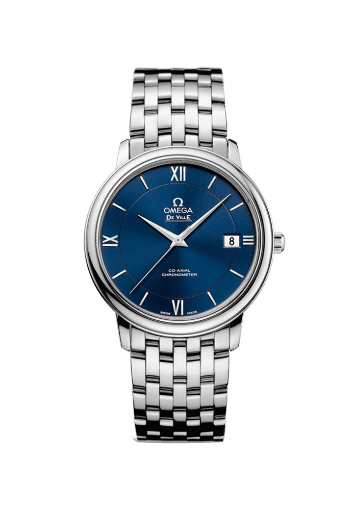 Die OMEGA De Ville Prestige-Kollektion konnte sich im Laufe der Jahre dank ihres klassisch-eleganten Designs eine große und treue Anhängerschaft sichern. Diese Zeitmesser, die sich durch ihren reinen und klassischen Stil mit luxuriöser Endverarbeitung auszeichnen, verkörpern ein zeitloses Design. Dieses Modell verfügt über ein bemerkenswertes, aus zwei voneinander abgesetzten Zonen bestehendes, blaues Zifferblatt mit Sonnenschliff und klassischen römischen Ziffern bei 3, 6, 9 und 12 Uhr. Ein kratzresistentes Saphirglas schützt das eindrucksvolle Zifferblatt mit Datumsfenster bei 3 Uhr. Die Lünette ist auf einem 36,8-mm-Gehäuse aus Edelstahl mit passendem Edelstahlarmband angebracht. Das Herzstück dieses Zeitmessers bildet das Co-Axial Kaliber 2500.