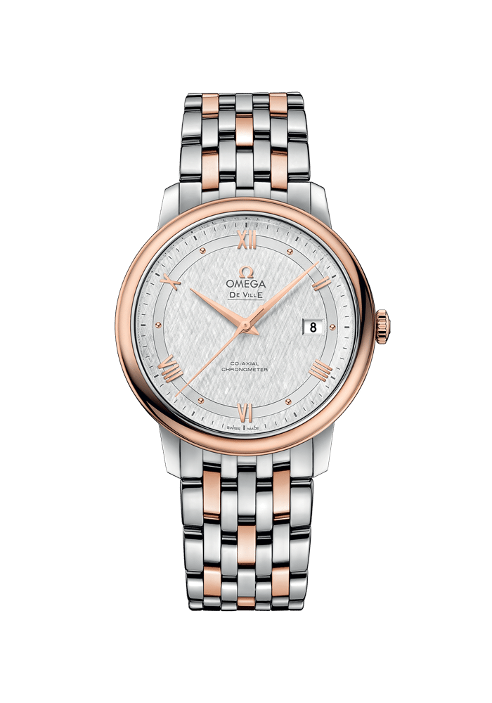 Diese De Ville Prestige wird von einem Armband aus Edelstahl und 18 K Rotgold am Handgelenk gehalten und durch das OMEGA Co-Axial Chronometerkaliber 2500 angetrieben.