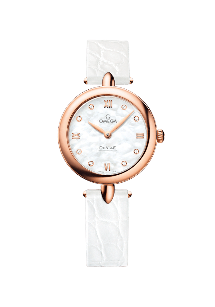 Dieser elegante Zeitmesser wird von einem OMEGA Kaliber 4061 angetrieben und einem weißen Lederarmband mit polierter Schließe am Handgelenk gehalten.