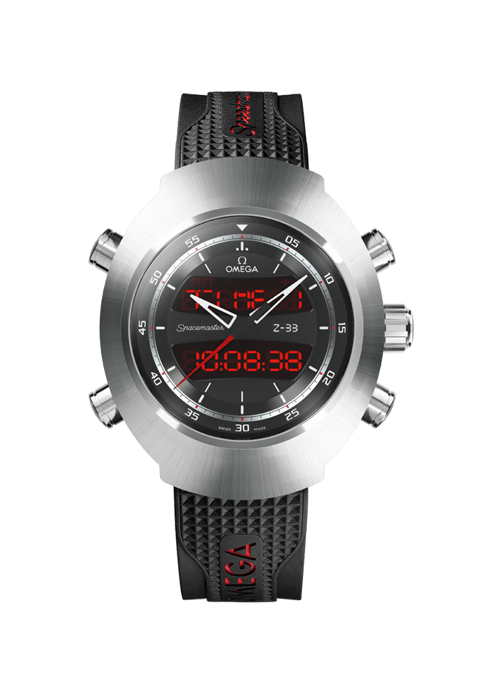 Diese OMEGA Speedmaster Spacemaster Z-33 wurde von der markanten Gehäuseform der „Pilot“-Linie inspiriert und mit einem brandneuen Multifunktionsquarzwerk, dem Kaliber 5666, ausgestattet. Über dem digitalen Zifferblatt schweben drei analoge Zeiger, die über die Krone bei 3 Uhr eingestellt werden.