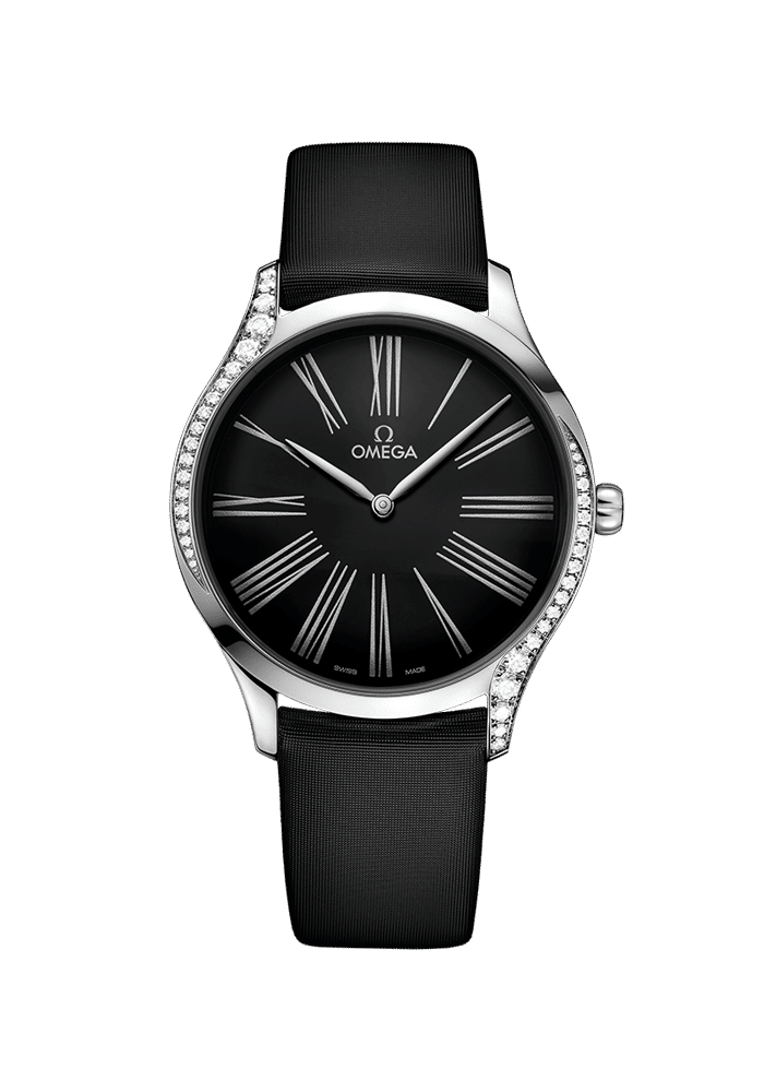 Das schlanke 39 mm große Gehäuse besteht aus Edelstahl und ist mit einem Diamantbesatz, der sich an den beiden äußeren Seiten an das Gehäuse schmiegt, sowie einer Krone, die mit roter „HyCeram“ poliert und mit einem Diamanten besetzt ist, versehen. Das schwarz lackierte Zifferblatt verfügt über einzigartige versetzte römische Ziffern und rhodinierte Zeiger.