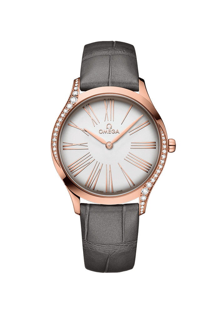 Die Uhr wird von OMEGAs Kaliber 4061 angetrieben, das sich hinter einem Gehäuseboden aus speziellem Glas mit „Time for Her“-Dekor befindet. Abgerundet wird das Ensemble durch ein graues Lederarmband.