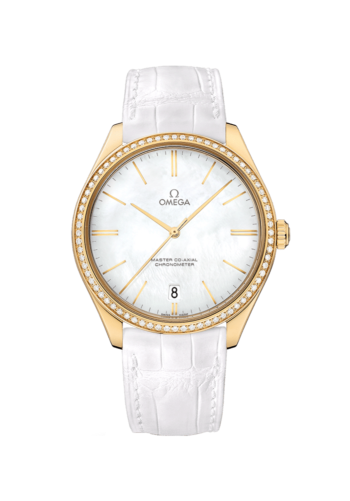 Dieses Modell verfügt über ein gewölbtes weißes Perlmuttzifferblatt mit polierten Zeigern aus 18 K Gold und einem Datumsfenster bei 6 Uhr. Das 40 mm große Gehäuse aus 18 K Gelbgold mit diamantbesetzter Lünette ist mit einem weißen Lederarmband mit polierter Schließe versehen. Angetrieben wird diese De Ville Trésor von OMEGAs antimagnetischem Master Co-Axial Kaliber 8511, einem einzigartigen Uhrwerk mit Handaufzug.