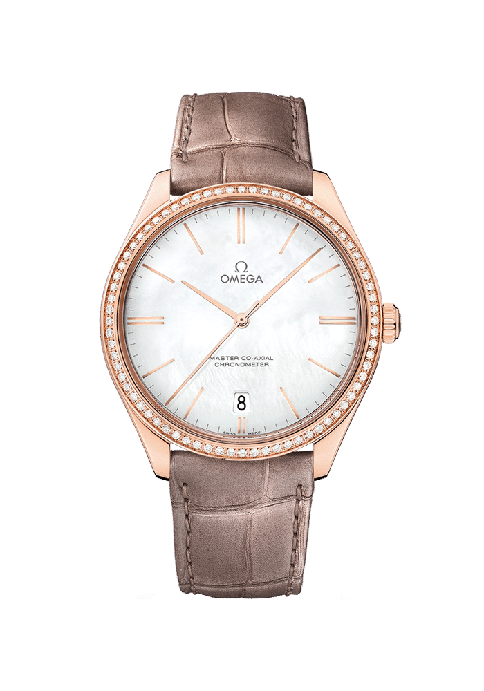 Dieses Modell verfügt über ein gewölbtes weißes Perlmuttzifferblatt mit polierten Zeigern aus 18 K Gold und einem Datumsfenster bei 6 Uhr. Das 40 mm große Gehäuse aus 18 K Sedna™-Gold mit diamantbesetzter Lünette ist mit einem braunen Lederarmband mit polierter Schließe versehen. Angetrieben wird diese De Ville Trésor von OMEGAs antimagnetischem Master Co-Axial Kaliber 8511, einem einzigartigen Uhrwerk mit Handaufzug.