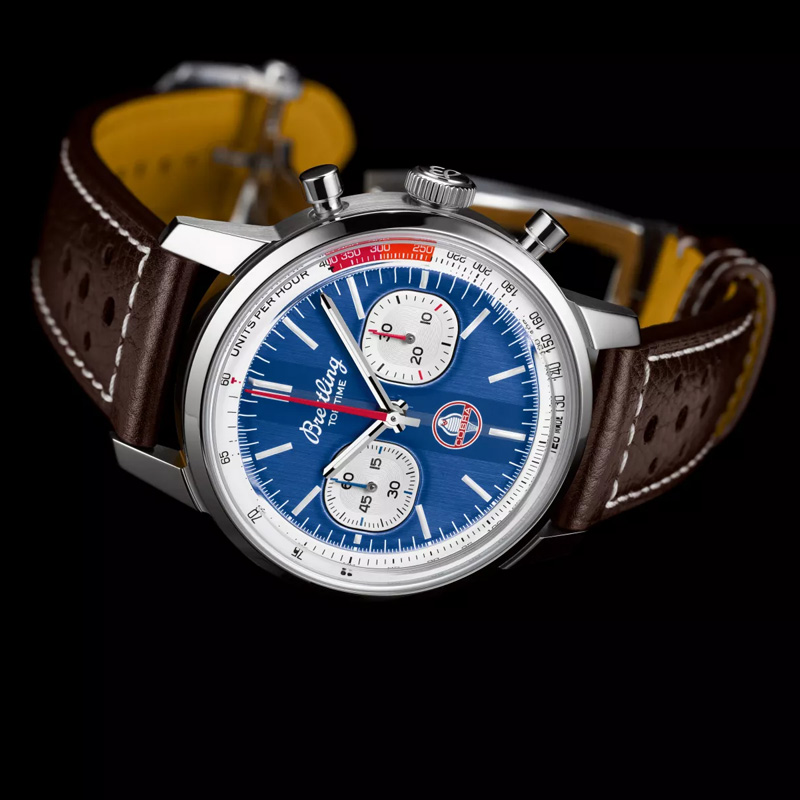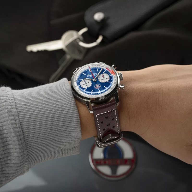 Der 41 Millimeter große Chronograph bringt Armaturenbrett-Atmosphäre ans Handgelenk, indem er stolz das Cobra-Emblem präsentiert. Das dunkelblaue Zifferblatt ist nicht ganz quadratisch und auch nicht rund geformt, was sofort Erinnerungen an den berühmten 1962 Oldtimer-Rennwagen mit den breiten Kotflügeln und seiner muskulösen Form weckt. Wer die Geschwindigkeit messen möchte, kann diese an der roten Tachymeter Skala ablesen. Ein braunes Kalbslederarmband im Rennsportstil sorgt für einen sicheren Sitz der Breitling „Top Time B01 Shelby Cobra”, auch wenn es mal schnell in die Kurve geht.