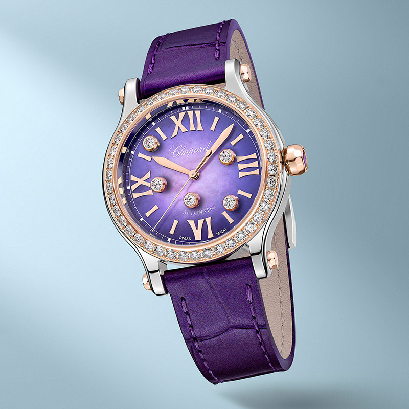 Die Gestaltung der neuen „Happy Sport Midnight Purple” der Maison Chopard beruht auf dem Goldenen Schnitt und bezieht auch das hauseigene mechanische Uhrwerk mit Automatikaufzug ein. Dank einer Gangreserve von beinahe zwei Tagen dürfen die Sommernächte ohne Bedenken in vollen Zügen ausgekostet werden. Und die zierlichen Proportionen von 33 Millimeter sind am Alligator-Lederband in Blau-Violett angenehm zu tragen. So zeigt Chopard mit der „Happy Sport Midnight Purple”-Damenuhr, wie sich wunderbare Farbverläufe mit strahlenden Diamanten und robustem Edelstahl verbinden. Eine uhrmacherische Spitzenleistung, die in Kombination mit herausragendem Schmuckdesign jeder Ihrer Sommer-Eskapaden eine unvergleichliche Lebensfreude und Ihren Gedanken Flügel verleiht.