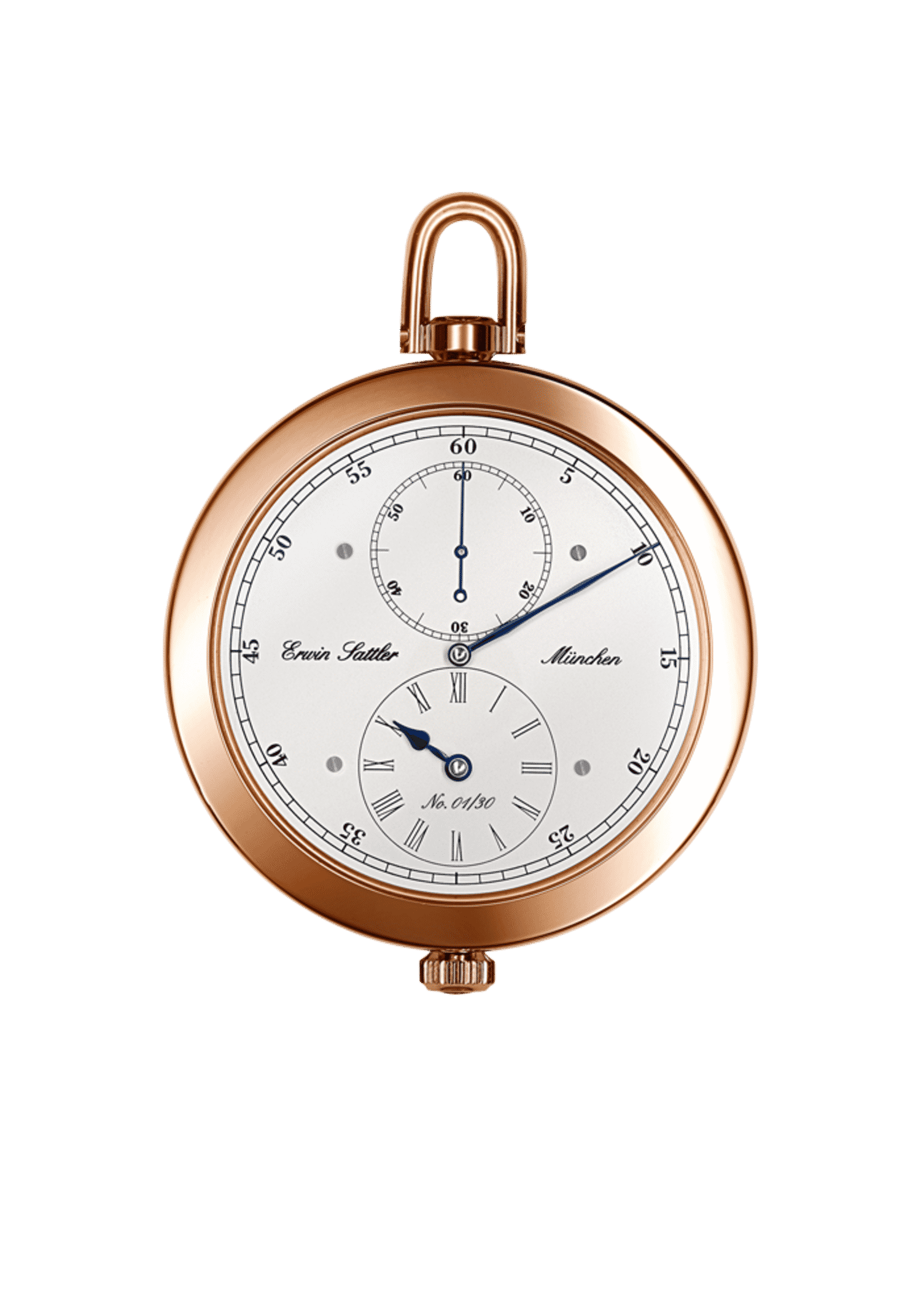 Allerdings wurde punktuell an der Substanz des alten Uhrwerkes noch Hand angelegt bzw. wurden Verbesserungen eingebaut. Mit einem verschraubten Minutenradchaton wurde noch der letzte fehlende Rubinlagerstein ergänzt und durch die fein bearbeitete Schwanenhalsfeinregulierung lässt sich die Taschenuhr nun auch stilvoll feinregulieren. Diese beiden Komponenten sind, von der Konstruktion bis zur Ausführung, komplett in der Manufaktur in Handarbeit entstanden. Das massive Silber-Zifferblatt zeigt deutlich die Sattlerschen Gene: Regulatoranzeige mit oben liegender Sekundenskala, einer feinen „Eisenbahn“-Minuterie und römischen Stundenziffern. Dies spiegelt eindeutig die Verwandtscha¢ zu solch imposanten Zeitmessern wie der Präzisionsuhr Classica Secunda 1985 wider. Selbstverständlich kommen auch bei der Taschenuhr von Hand bombierte, polierte sowie gebläute Stahlzeiger zum Einsatz und vervollständigen so das Meisterstück. Für eine angemessene Präsentation ruht der Zeitmesser in einer Klappbox aus edlem Makassar, die optionale Uhrenkette aus massivem 750er Roségold gestattet den klassischen Einsatz der Taschenuhr und vervollständigt das Ensemble.