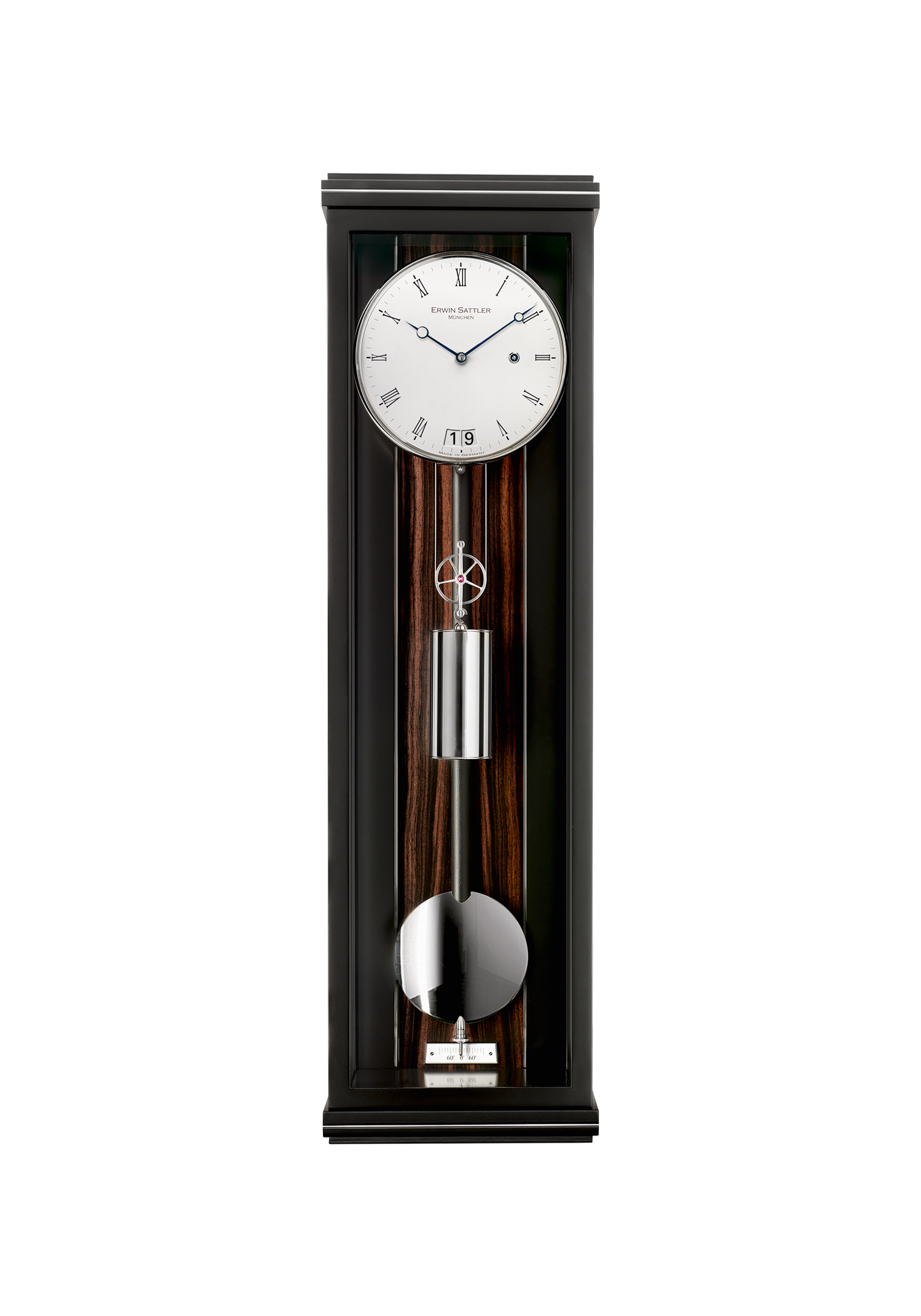In einem so genannten Passageschlag wird mit einem einfachen Schlag auf eine Tonfeder jede volle Stunde signalisiert. Optisch erfreut der Monatsläufer mit seinem schönen Gehäuse aus schwarzem Schleiflack und dem eloxierten, modern arabischen Zifferblatt, das die Optik des schlichten Großdatums auf harmonische Weise ergänzt.