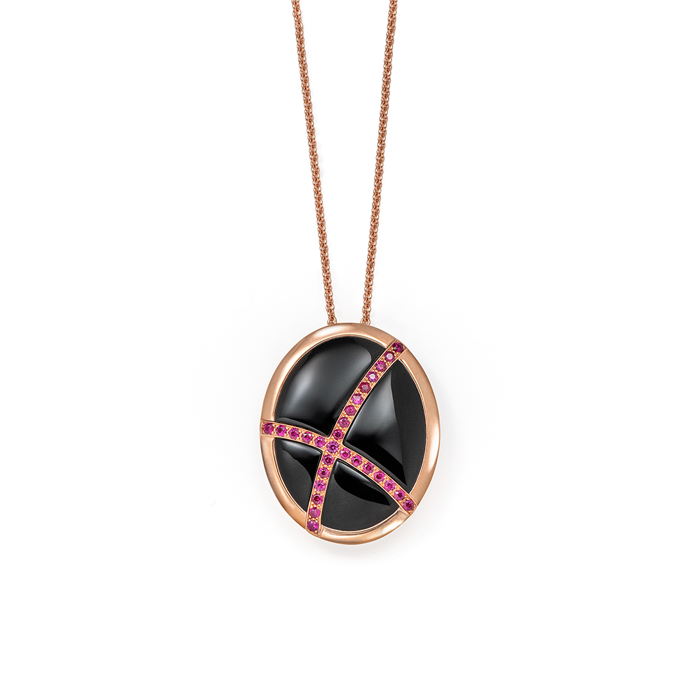 Anhänger in Weissgold 750 mit Onyx und Rubinen