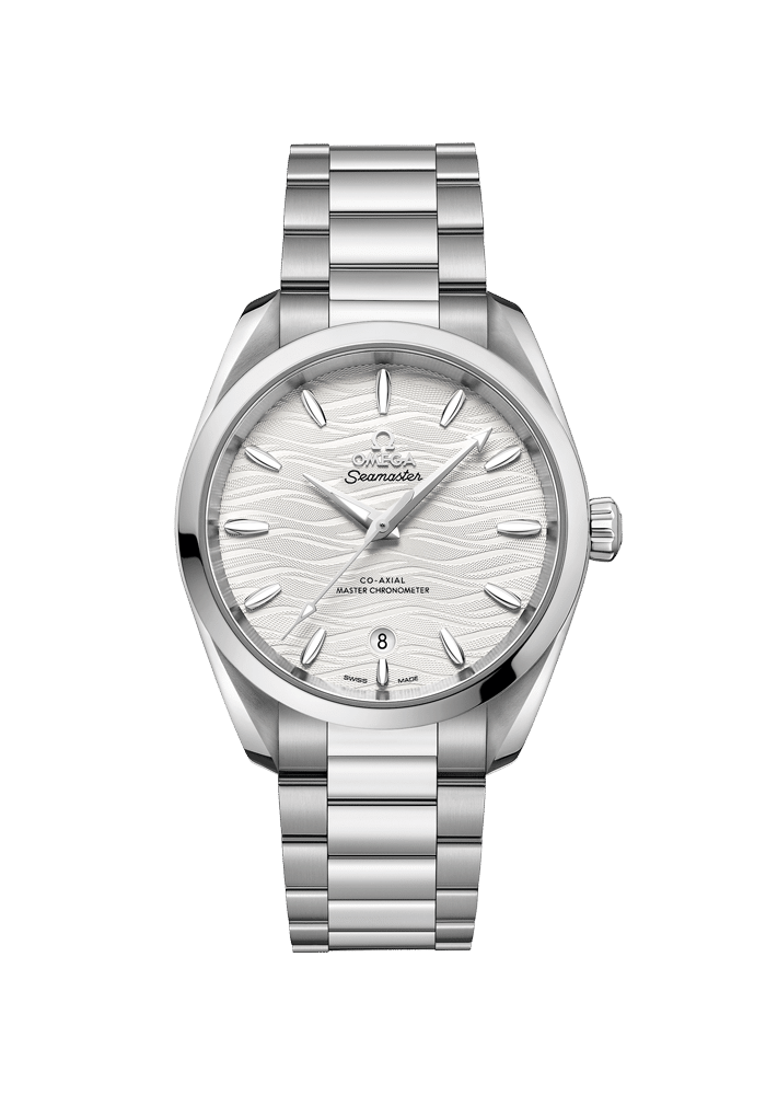 Die Seamaster Aqua Terra für Damen ist ein Ausdruck wahrer Eleganz. Während sich ihr maritimer Charakter in ihrem Design bemerkbar macht, zeugen edelste Materialien und Uhrwerke von einer ganz besonderen Raffinesse. Bei diesem Modell sind das symmetrische 38-mm-Gehäuse und das integrierte Armband aus Edelstahl gefertigt. Das wellenförmige opalisierende versilberte Zifferblatt verfügt über ein Datumsfenster bei 6 Uhr sowie rhodinierte Zeiger und Indizes aus 18 K Weißgold, die Segelbootrümpfen nachempfunden wurden. Angetrieben wird die Uhr vom OMEGA Master Chronometer-Kaliber 8800, das vom Eidgenössischen Institut für Metrologie (METAS) gemäß den höchsten Branchenstandards zertifiziert wurde.