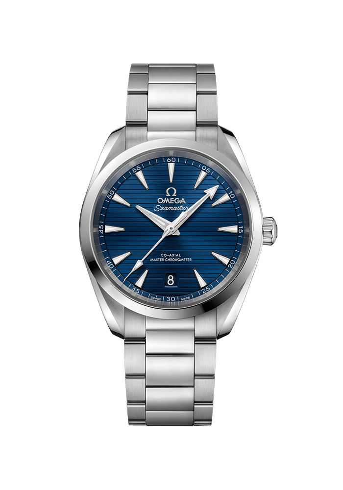 Die Seamaster Aqua Terra ist ein Tribut an OMEGAs großes maritimes Erbe. Das symmetrische Gehäuse dieses 38-mm-Modells besteht aus Edelstahl und ist auf der Rückseite mit einem Wellendekor versehen.