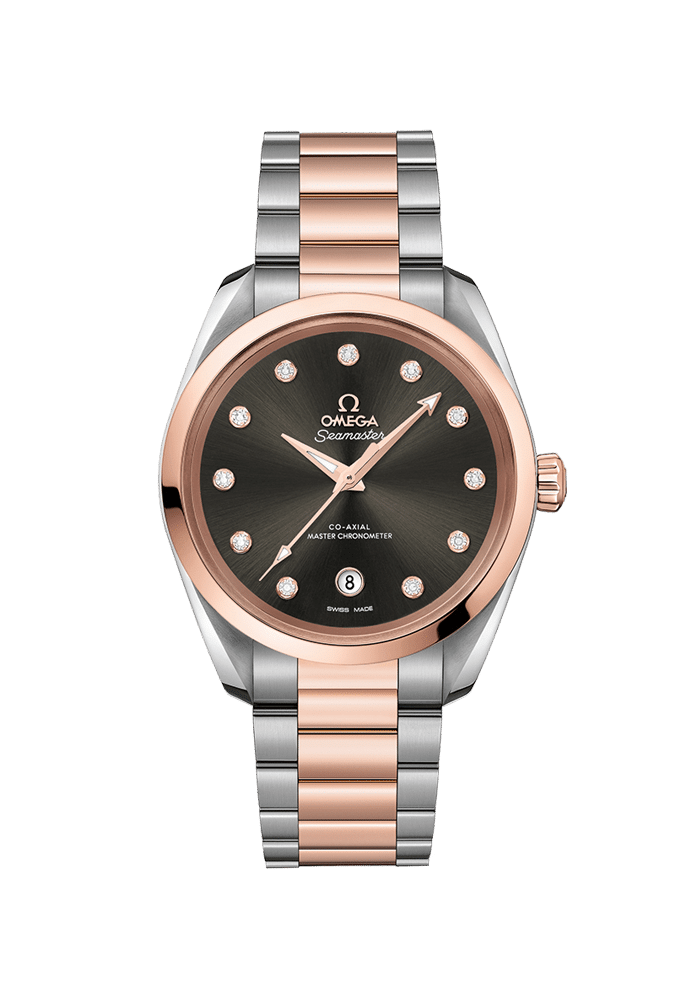 Dieses Modell mit einem symmetrischen 38-mm-Gehäuse aus Edelstahl und 18 K Sedna™-Gold verfügt über ein glänzendes graues Zifferblatt mit einem Datumsfenster bei 6 Uhr und 11 diamantbesetzten Indizes in Fassungen aus 18 K Sedna™-Gold.