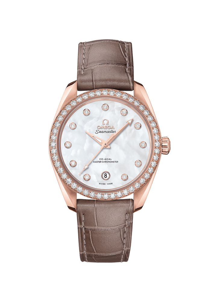 Die Seamaster Aqua Terra für Damen ist von Diamanten umgeben und ein wahrer Ausdruck von Eleganz. Dieses Modell mit einem symmetrischen 38-mm-Gehäuse aus 18 K Sedna™-Gold verfügt über ein weißes Perlmuttzifferblatt mit einem Datumsfenster bei 6 Uhr und 11 diamantbesetzten Indizes in Fassungen aus 18 K Sedna™-Gold. Die Lünette ist ebenfalls mit Diamanten besetzt und die Uhr wird von einem taupefarbenen Lederarmband mit polierter Faltschließe am Handgelenk gehalten. Angetrieben wird das Modell von dem OMEGA Co-Axial Master Chronometer Kaliber 8801, das vom Eidgenössischen Institut für Metrologie (METAS) zertifiziert wurde und höchsten Branchenstandards entspricht.