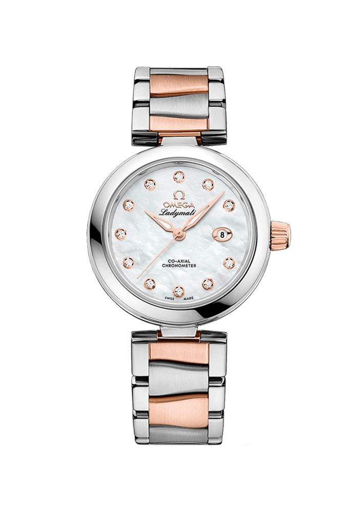 Das Edelstahlgehäuse dieses Modells wird durch ein gebürstetes Metallarmband mit wellenförmigen Rändern am Handgelenk gehalten, das aus 18 K Sedna™-Gold und Edelstahl besteht, und auch die polierten alphaförmigen Zeiger sowie die 11 diamantbesetzten Indizes sind aus Sedna™-Gold gefertigt.