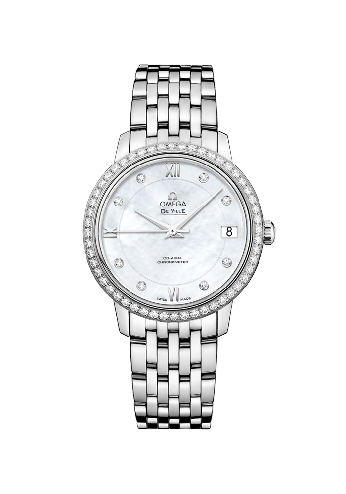 Ein kratzresistentes Saphirglas schützt das eindrucksvolle Zifferblatt mit Datumsfenster bei 3 Uhr. Die diamantbesetzte Lünette ist auf einem 32,7-mm-Gehäuse aus Edelstahl mit passendem Edelstahlarmband angebracht. Das Herzstück dieses Zeitmessers bildet das Co-Axial Kaliber 2500.