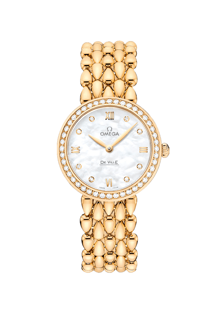 Das 18-K-Gelbgoldgehäuse dieses 27,40-mm-Quarzmodells krönt eine funkelnde diamantbesetzte Lünette mit drei tropfenförmigen Bandanstößen auf jeder Seite. Die Rückseite ist mit einem eingeprägten Medaillon, das den Gott Chronos zeigt, sowie mit einem eingravierten De Ville-Logo versehen.