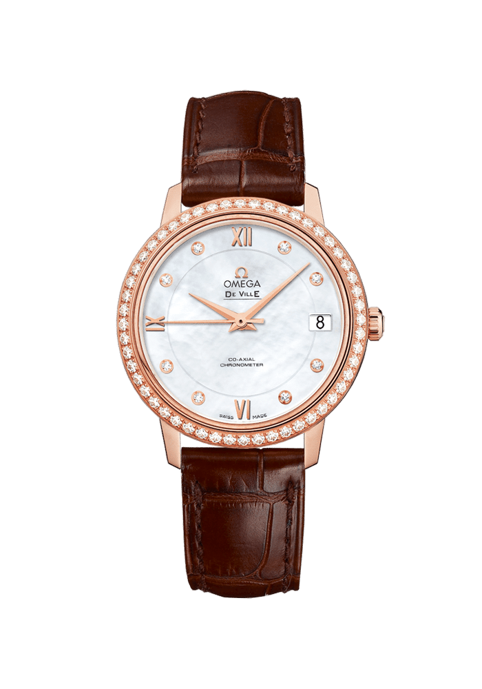 Ein kratzresistentes Saphirglas schützt das eindrucksvolle Zifferblatt mit Datumsfenster bei 3 Uhr. Die diamantbesetzte Lünette ist auf einem 32,7-mm-Gehäuse aus 18 K Rotgold mit braunem Lederarmband angebracht. Das Herzstück dieses Zeitmessers bildet das Co-Axial Kaliber 2500.
