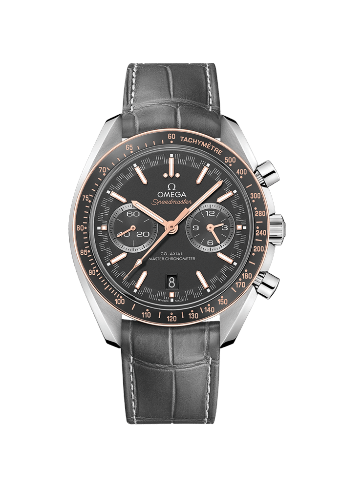 Dieses Speedmaster Racing Master Chronometer-Modell mit grauem Lederarmband kennzeichnet ein 44,25-mm-Gehäuse aus Edelstahl mit einer Lünette aus 18 K Sedna™-Gold. Der Lünettenring aus Siliziumnitrid ist mit der berühmten Tachymeterskala in OMEGA Ceragold™ versehen. Auf dem mattgrauen Zifferblatt findet sich ein markanter Minutenring im „Racing“-Stil, dem die Uhr ihren Namen verdankt. Auch gibt es zwei Hilfszifferblätter mit rhodinierten applizierten Ringen sowie ein Datumsfenster bei 6 Uhr, das farblich auf das Zifferblatt abgestimmt ist. Der Stunden- und Minutenzeiger und die Indizes mit Pfeilspitzen bestehen aus 18 K Sedna™-Gold mit weißer Super-LumiNova. Angetrieben wird die Uhr von OMEGAs Co-Axial Master Chronometer 9900, das vom METAS nach dem höchsten Branchenstandard zertifiziert wurde.