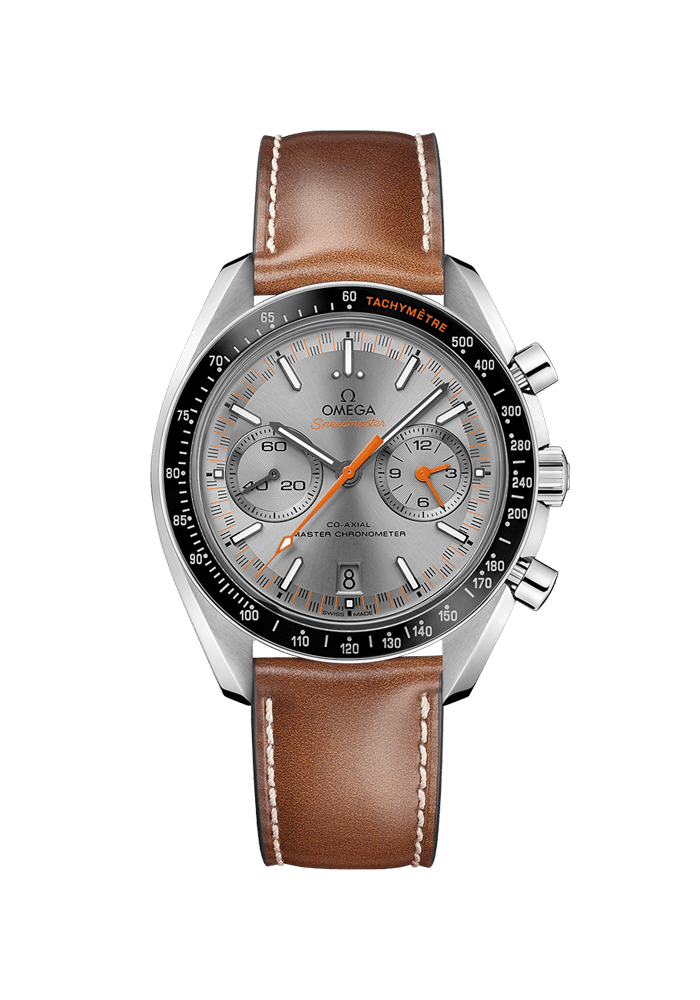 Dieses Speedmaster Racing Master Chronometer-Modell kennzeichnet ein 44,25-mm-Gehäuse aus Edelstahl mit braunem Lederarmband und einem Lünettenring aus schwarzer Keramik, der mit der berühmten Tachymeterskala mit orangefarbenem Schriftzug und Ziffern aus Liquidmetal™ versehen ist. Auf dem grauen Zifferblatt mit Sonnenschliff findet sich ein markanter Minutenring im „Racing“-Stil, dem die Uhr ihren Namen verdankt. Auch gibt es zwei Hilfszifferblätter mit rhodinierten applizierten Ringen sowie ein Datumsfenster bei 6 Uhr, das farblich auf das Zifferblatt abgestimmt ist. Während die Zeiger entweder geschwärzt oder orange lackiert sind, bestehen die Indizes mit Pfeilspitzen aus 18 K Weißgold mit weißer Super-LumiNova. Angetrieben wird die Uhr von OMEGAs Co-Axial Master Chronometer 9900, das vom METAS nach dem höchsten Branchenstandard zertifiziert wurde.