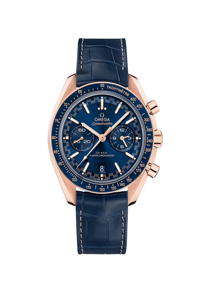 Dieses Speedmaster Racing Master Chronometer-Modell kennzeichnet ein 44,25-mm-Gehäuse aus 18 K Sedna™-Gold mit blauem Lederarmband. Zur Lünette gehören ein blauer Keramikring und die berühmte Tachymeterskala in OMEGA Ceragold™. Auf dem blauen Zifferblatt mit Sonnenschliff findet sich ein markanter Minutenring im „Racing“-Stil, dem die Uhr ihren Namen verdankt. Auch gibt es zwei gebläute Hilfszifferblätter sowie ein Datumsfenster bei 6 Uhr, das farblich auf das Zifferblatt abgestimmt ist. Der Stunden- und Minutenzeiger und die Indizes mit Pfeilspitzen bestehen aus 18 K Sedna™-Gold mit weißer Super-LumiNova. Angetrieben wird die Uhr von OMEGAs Co-Axial Master Chronometer 9901, das vom METAS nach dem höchsten Branchenstandard zertifiziert wurde.
