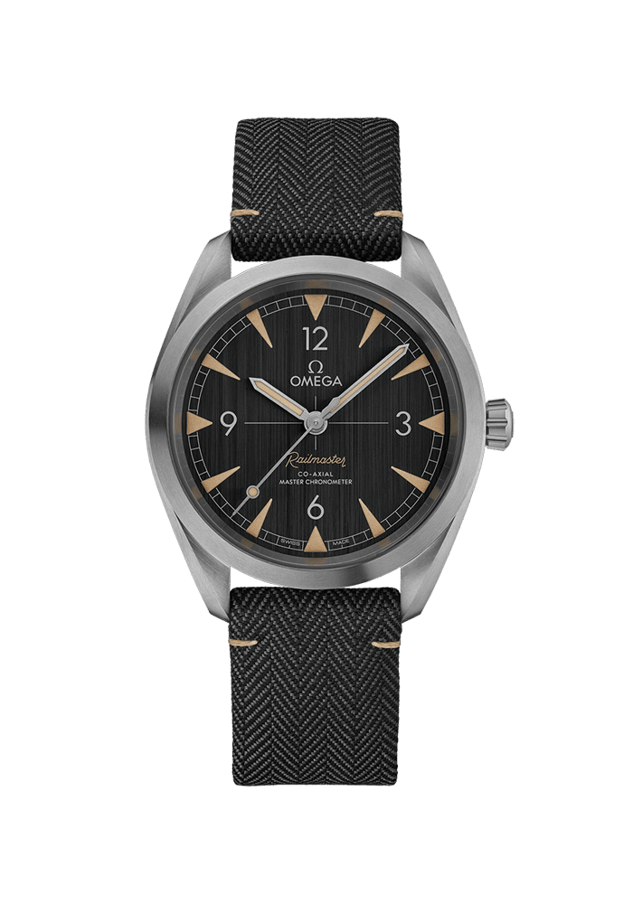 Die originale OMEGA Railmaster von 1957 war eine schlichte, praktische und doch elegante Uhr, die für Bahnpersonal und andere Menschen entwickelt wurde, die in Reichweite elektrischer Felder arbeiteten. Heute hat der Innovationsgeist zu einer Neuauflage der Railmaster geführt, die über noch bessere Funktionen verfügt. Das symmetrische Gehäuse des 40-mm-Modells besteht aus Edelstahl und ist auf der Rückseite mit einem Wellendekor versehen. Das vertikal gebürstete schwarze Zifferblatt verfügt über gebürstete Edelstahlzeiger? und vertiefte Stundenindizes, die mit „Vintage“-Super-LumiNova gefüllt sind. Es ist außerdem mit einem beigefarbenen „Railmaster“-Aufdruck versehen, das dem Design eine klassische Ästhetik verleiht. Die Uhr wird von einem Textilarmband in zwei Grautönen am Handgelenk gehalten und der ausgerichtete Gehäuseboden verfügt über ein NAIAD-LOCK-Design (angemeldetes Patent), das den Schriftzug immer in der richtigen Position zeigt. Angetrieben wird die Uhr von dem OMEGA Co-Axial Master Chronometer Kaliber 8806. Dieses Railmaster-Modell wurde vom Eidgenössischen Institut für Metrologie (METAS) zertfiziert und hält Magnetfeldern von bis zu 15.000 Gauß stand, was an die bereits hervorragenden Eigenschaften seines Vorgängers erinnert.
