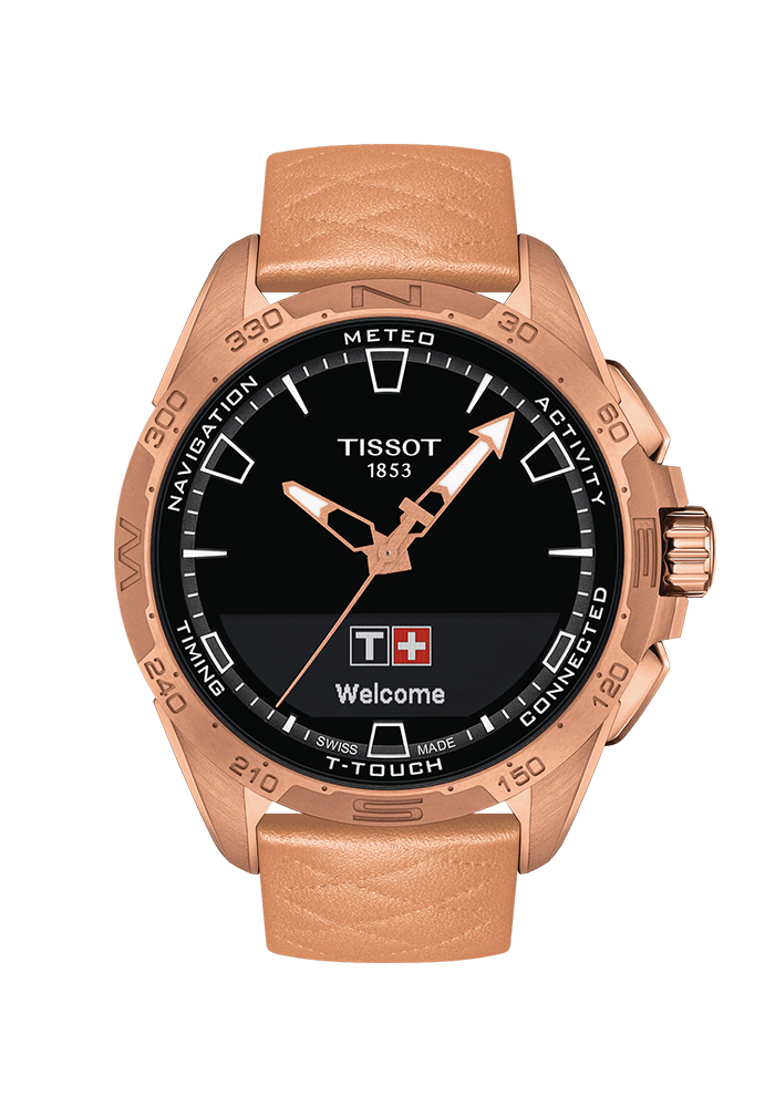 Als Nachfolger der ersten taktilen Multifunktionsuhr der Geschichte – die 1999 von Tissot auf den Markt gebrachte T-Touch – ist die jetzige T-Touch Connect Solar ein Sinnbild der Marken-Philosophie: Innovators by Tradition. Die 47 Millimeter messende Tissot T-Touch Connect Solar präsentiert sich dank eines Titangehäuses mit Keramiklünette leicht, hypoallergen und robust. Bedient wird sie über das taktile, kratzfeste Saphirglas, eine elektronische Krone sowie 2 Drücker. Die Verbindung mit dem Smartphone erfolgt per Bluetooth und mit der im App Store, über Google Play sowie die Huawei App Gallery verfügbaren Tissot T-Touch Connect Solar App. Diese Konnektivität erlaubt die Anzeige eingehender Anrufe und aller gewünschten Benachrichtigungen auf dem energiesparenden Memory-In-Pixel Display. Regelmäßige Updates bieten Raum für sukzessive Erweiterungen des Funktionsumfangs. Sehr bewusst hybrid konzipiert, behält Tissots Innovation den Großteil ihrer Funktionalität auch ohne Verbindung zum Smartphone bei. Dazu zählen unter anderem: Activity Tracker (Schrittzähler, zurückgelegte Distanz, Kalorienverbrauch), Kompass, Barometer, Temperaturanzeige, Höhen- und Höhendifferenzmesser, zweite Zeitzone, ewiger Kalender, Countdown sowie verschiedene Stopp- und Alarmfunktionen. Durch Sonnenlicht gespeist, ist die Laufzeit der Tissot T-Touch Connect Solar im Offline-Modus quasi unbegrenzt. Im Connected-Modus erzielt sie, je nach Nutzungsverhalten des Trägers und Sonneneinstrahlung, mindestens 6 Monate Gangautonomie. Sie stützt sich hierfür auf modernste, im Zifferblatt integrierte Solarzellen, um ihren Akku, von stationärem Laden weitestgehend unabhängig, dauerhaft mit Energie zu versorgen. Das eigens in der Schweiz entwickelte „Sw-ALPS“ Betriebssystem gewährleistet die Kompatibilität mit iOS, Android und Harmony OS von Huawei. Im Rahmen der Konzeption dieser Uhr wurden ganze 35 Patente angemeldet. Die Tissot T-Touch Connect Solar ist in verschiedenen Ausführungen wie satiniertem Titan, Titan mit schwarzer PVD-Beschichtung oder Titan mit roségoldfarbener PVD-Beschichtung erhältlich sowie mit Titan-, Kautschuk- oder Silikonarmband. Diese Ausführung der Tissot T-Touch Connect Solar verfügt über ein amagnetisches Titangehäuse mit roségoldfarbener PVD-Beschichtung sowie gleichfarbiger Keramiklünette mit Windrose-Markierungen. Markante, mit SuperLuminova® Leuchtbeschichtung versehene Stunden- und Minutenzeiger heben sich klar von dem schwarzen Zifferblatt ab und garantieren beste Ablesbarkeit. Das ebenfalls in einem Roségoldton gehaltene, geprägte Lederarmband verfügt über eine roségoldfarbene Dornschließe sowie über ein Schnellwechselsystem.